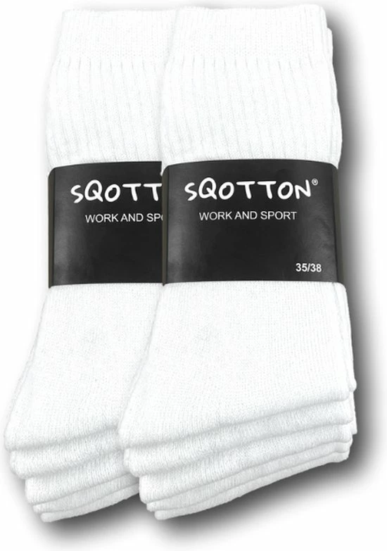 Set van 10 paar fijne sportsokken van het merk SQOTTON in de kleur wit. Deze sokken kunnen zowel tijdens het werken of sporten worden gedragen. Deze sportsokken hebben een uitstekend draagcomfort en zijn een ideale aanvulling op je werkkleding of sportkleding. Deze sokken hebben een stevige niet knellende boord waardoor de sokken goed blijven zitten en niet afzakken tijdens het sporten of tijdens het werken. De sokken zijn gemaakt van een hoog percentage katoen en hebben een dunne badstofvoering rondom de voet. Hierdoor zijn deze werksokken vocht absorberend, anti-transpirerend, ademend en zacht voor de huid. Dankzij de samenstelling van het materiaal en de verstevigde afwerking van de teennaad kunnen deze sokken tegen een stootje en gaan in vergelijk met andere sokken langer mee. Let er wel op dat de sokken niet te klein of niet te groot zijn. Te kleine of grote sokken zorgen al snel voor blaarvorming. De werksokken en/of sportsokken zijn verkrijgbaar in diverse maten en worden geleverd in een voordeelverpakking van 10 paar.