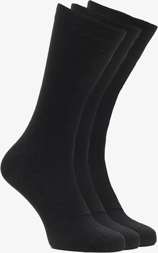 Drie paar zwarte sportsokken voor heren en dames van Osaga. De sokken zijn lang van lengte en gemaakt van 75% katoen, 22% polyester en 3% elastaan.