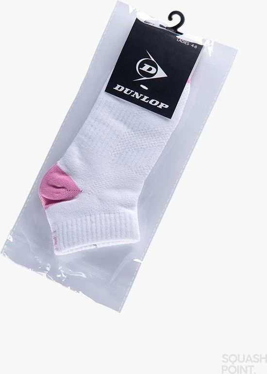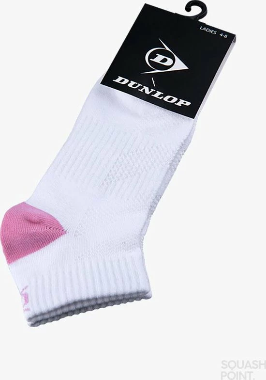 Deze witte Dunlop Dames Sokken met roze details hebben een goede pasvorm en ondersteunen je voeten optimaal. Aerodry technologie zorgt voor een uitstekende vochtafvoer zodat je voeten langer droog blijven. Zowel de tenen als de hak van de sok zijn extra verstevigd. Het voetbed van de sok is tevens dikker waardoor schokken beter worden opgevangen.