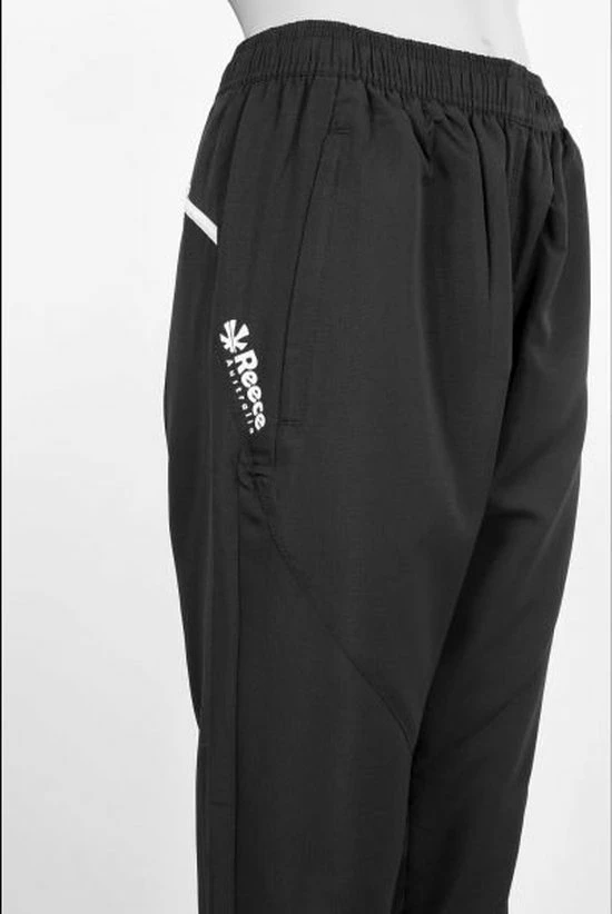 Varsity Woven Pants Dames van Reece Australia in de kleur zwart, geschikt voor dames. Deze trainingsbroek met ladies fit voelt licht en luchtig aan en is gemaakt van sterk materiaal (100% polyester ripstop). De broek heeft een rits tot aan de knie, waardoor je hem gemakkelijk over je schoenen heen aan- en uittrekt. Aan de voorzijde twee steekzakken met rits. Met een voering van mesh en een mesh panel op de achterzijde, met daar ook de kenmerkende Reece Australia belijning. De broek heeft een elastische tailleband met koord en een elastische afwerking bij de enkels.