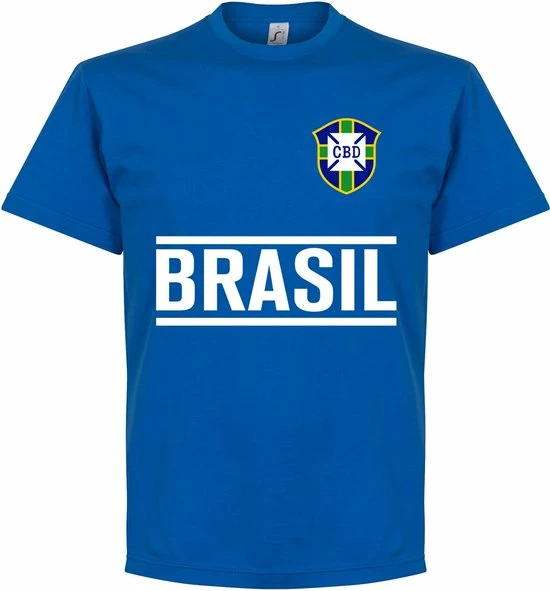 Gaaf Brazilië t-shirt van Retake. Dit t-shirt is geheel in stijl van de kleuren van het Brazilië uitshirt. Het t-shirt is blauw en bevat op het midden een print van de naam van het land. De linker borst bevat een print van een vintage embleem van de voetb