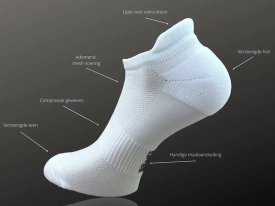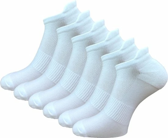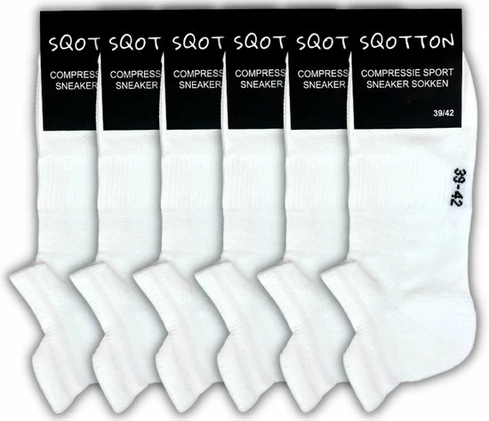 Set van 6 paar fijne compressie sneakersokken, hardloopsokken met lipje in de kleur wit van het merk SQOTTON. Deze sport sneakersokken kunnen zowel door dames en heren gedragen worden. De sokken hebben een prettig draagcomfort met zijn natuurlijke en vocht absorberende eigenschappen zijn deze sneakersokken de ideale sokken voor dagelijks gebruik en ook tijdens het sporten zoals hardlopen, voetballen, of fitness. Ook een ideale sok als je de hele dag staat. Deze compressie sneakersokken die net boven de schoen uitkomen zorgen voor stabiliteit aan de gewrichten en aderen van de voet hierdoor wordt de doorbloeding verbeterd waardoor de voet minder vermoeid aanvoelt. Over de compressie sok zit een speciale strak geweven band voor extra draagcomfort. Het materiaal boven op de voet zorgt voor goede ventilatie. De pasvorm en stof van de sneakersok zorgt dat de sok niet glijdt van de voet, hierdoor verminder je de kans op blaren. De sokken hebben een lage boord met lipje die tot de enkel valt. Het lipje bij de hiel zorgt ervoor dat de sok goed blijven zitten en niet gaat afzakken, ook wordt de hiel hiermee beschermd tegen de schoen. Daarbij zijn de sneakersokken voorzien van lichte voering bij de tenen en hak voor extra ondersteuning. Hierdoor zijn de sokken licht schok dempend. De sokken het liefst binnenstebuiten wassen met soortgelijke kleuren. Het wasprogramma mag niet hoger zijn dan 30 °C en niet strijken of een droger gebruiken. Deze hardloop sneakersokken zijn verkrijgbaar in verschillende maten en worden geleverd in een voordeelverpakking van 6 paar.