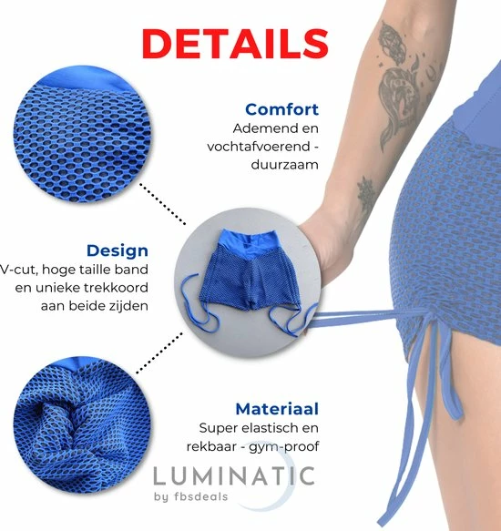 Net als de legging heeft deze TikTok shorts een honinggraattextuur ontwerp, die cellulitis vermindert. Daarnaast een hoge taille voor buikcontrole en een soepele, veilige pasvorm, waardoor je jouw figuur perfect laat uitkomen. Hierdoor gaan je billen eruit zien als een sappige perzik. Tot slot hebben deze shorts een unieke trekkoord sluiting, deze zijn ontworpen aan beide zijden en is verstelbaar.